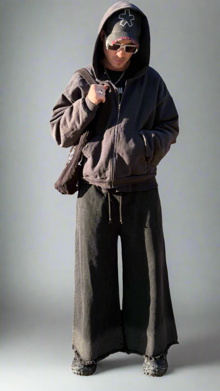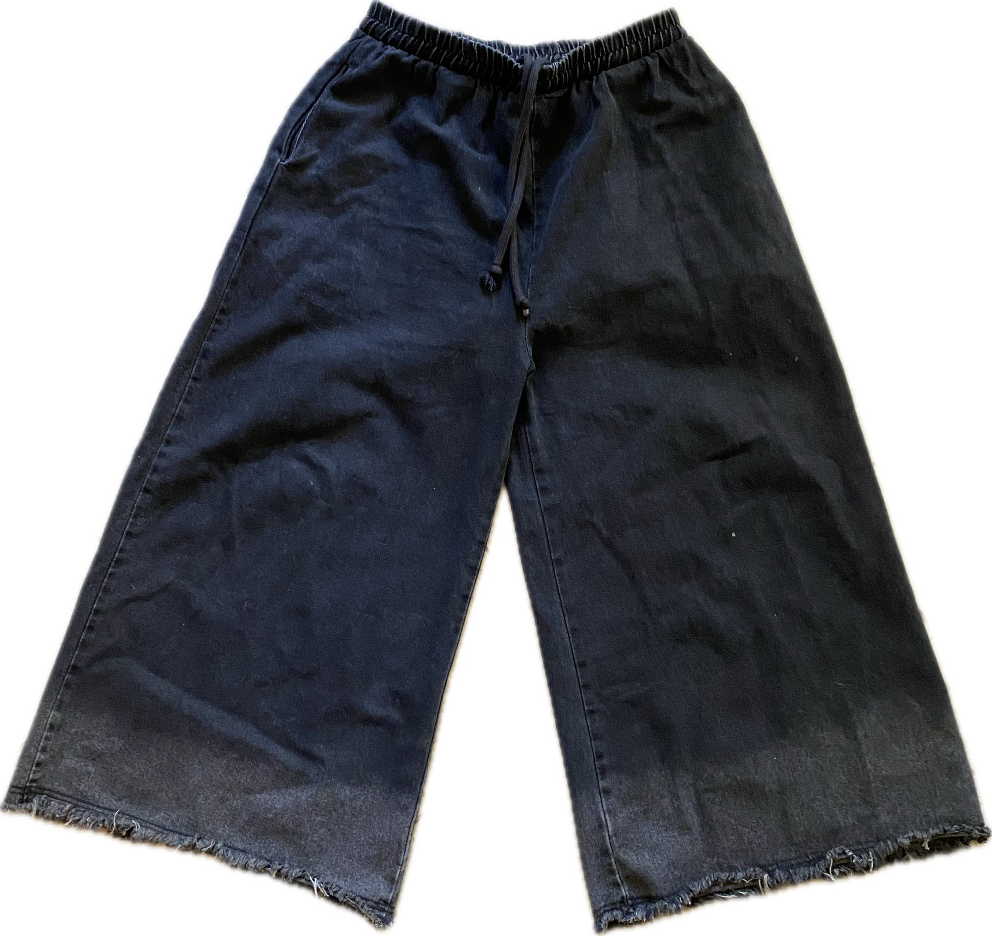 OUR SUPER WIDE LEG JEANS OFFER A WIDE LEG SILHOUETTE WHILE MAINTAINING A RELAXED FIT. FEATURES TWO FRONT POCKETS AND AN ELASTIC WAISTBAND WITH DRAWSTRINGS