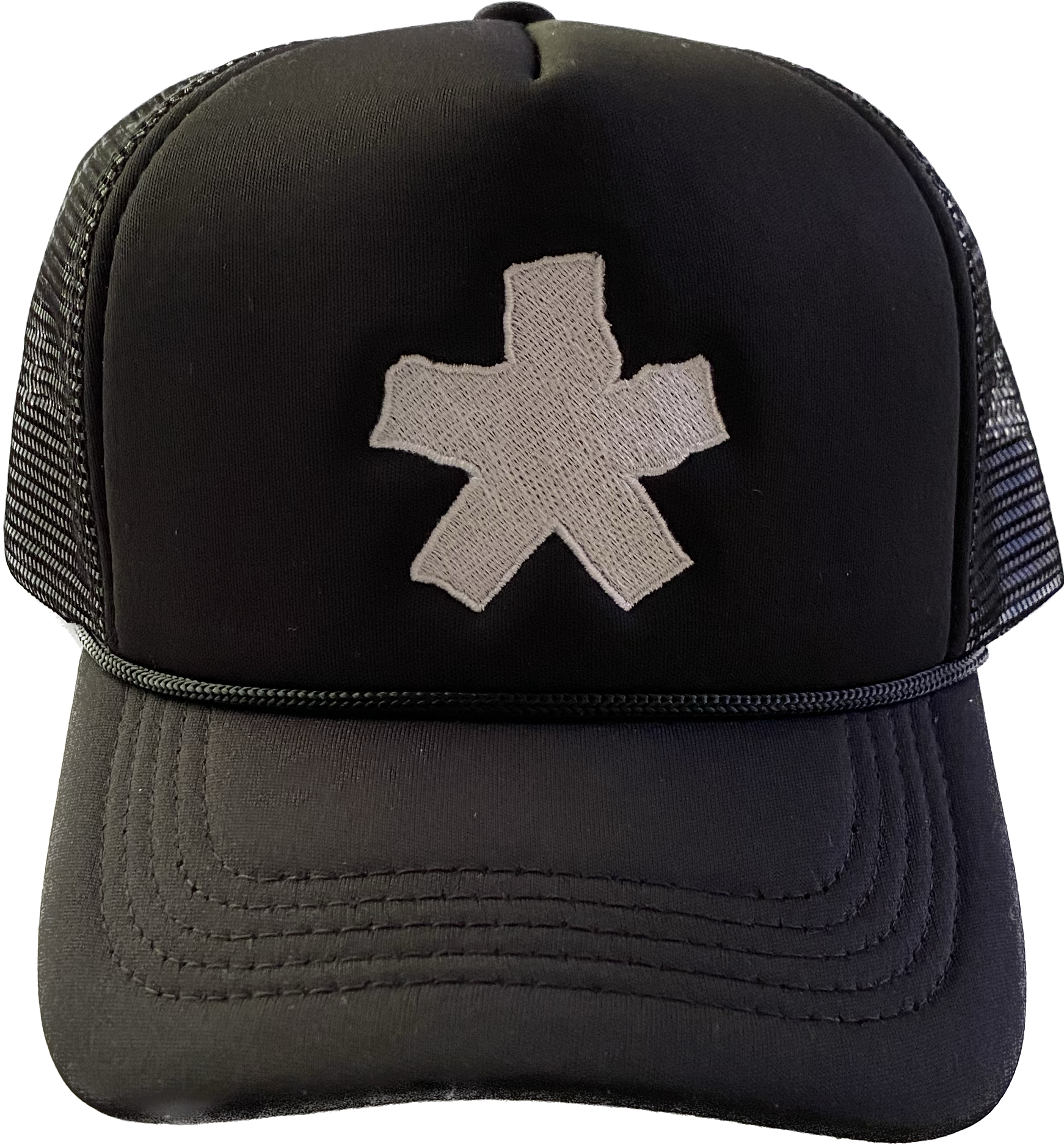 THE 'ASTERISK' HAT IS A HIGH STITCH COUNT EMBROIDERY ON HIGH QUALITY MESH TRUCKER HAT WITH A LEATHER CLASP BACK.