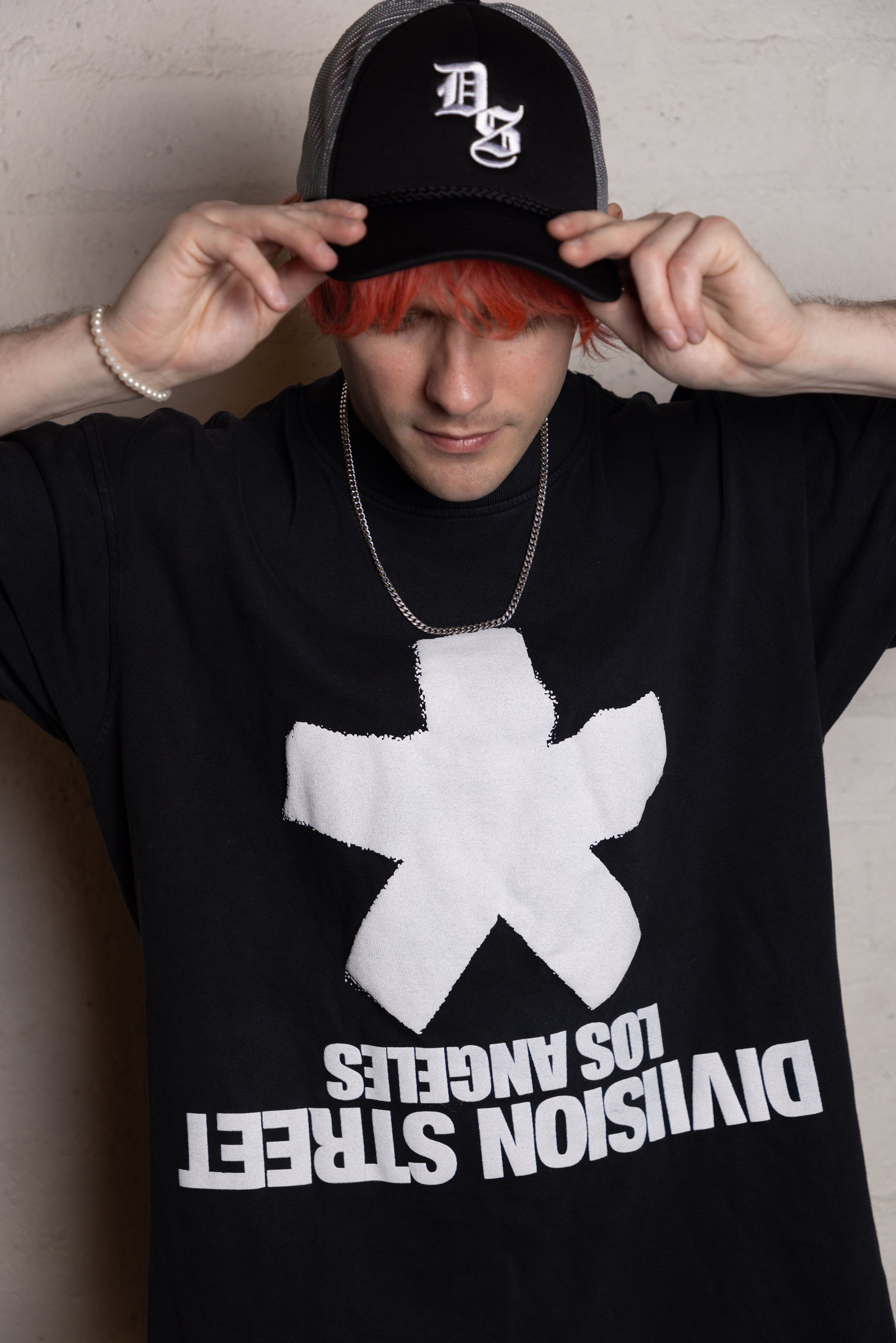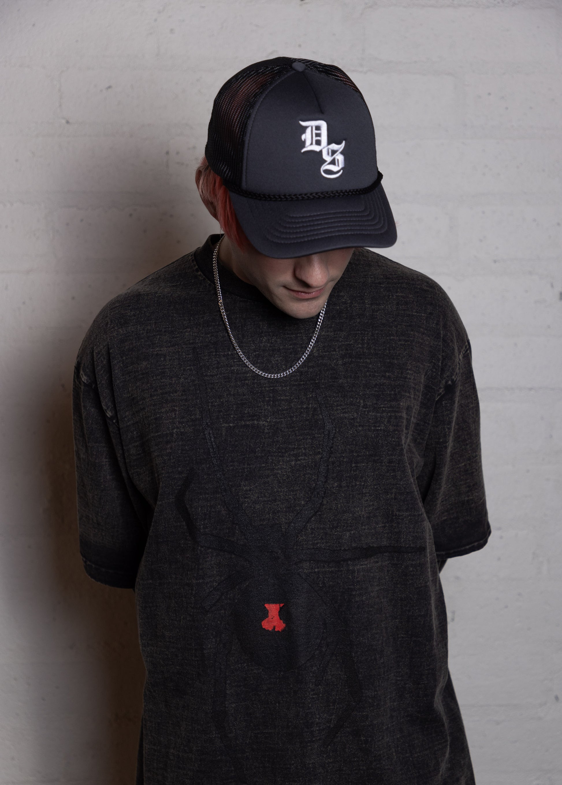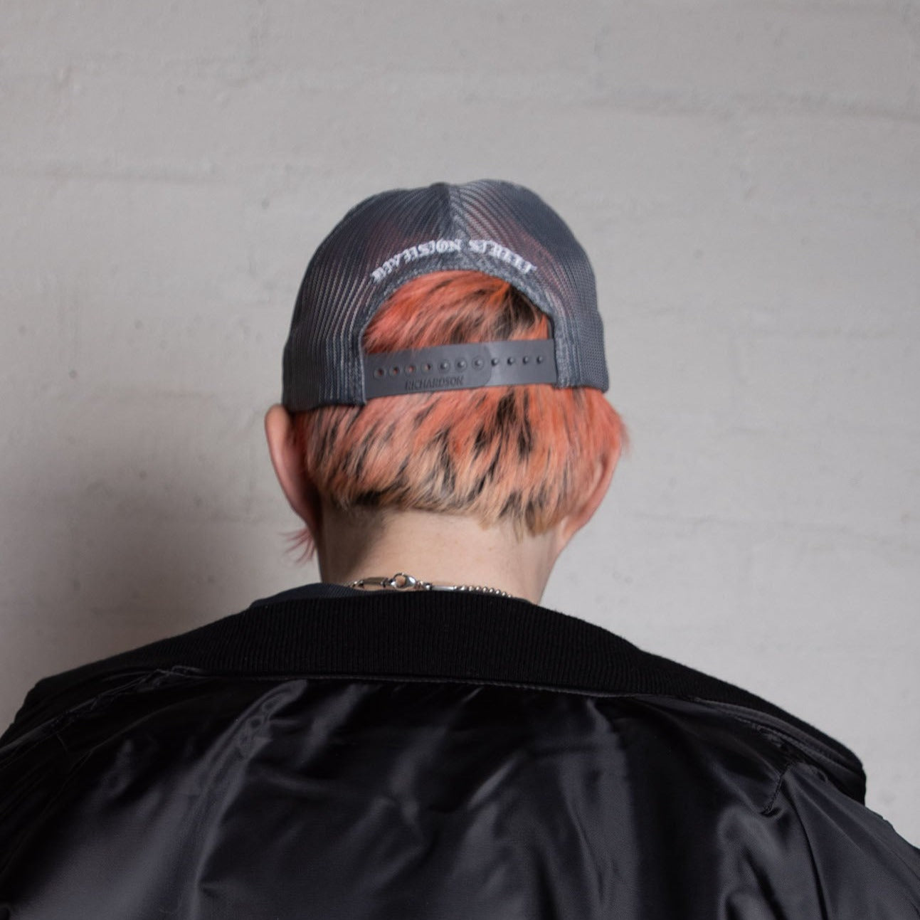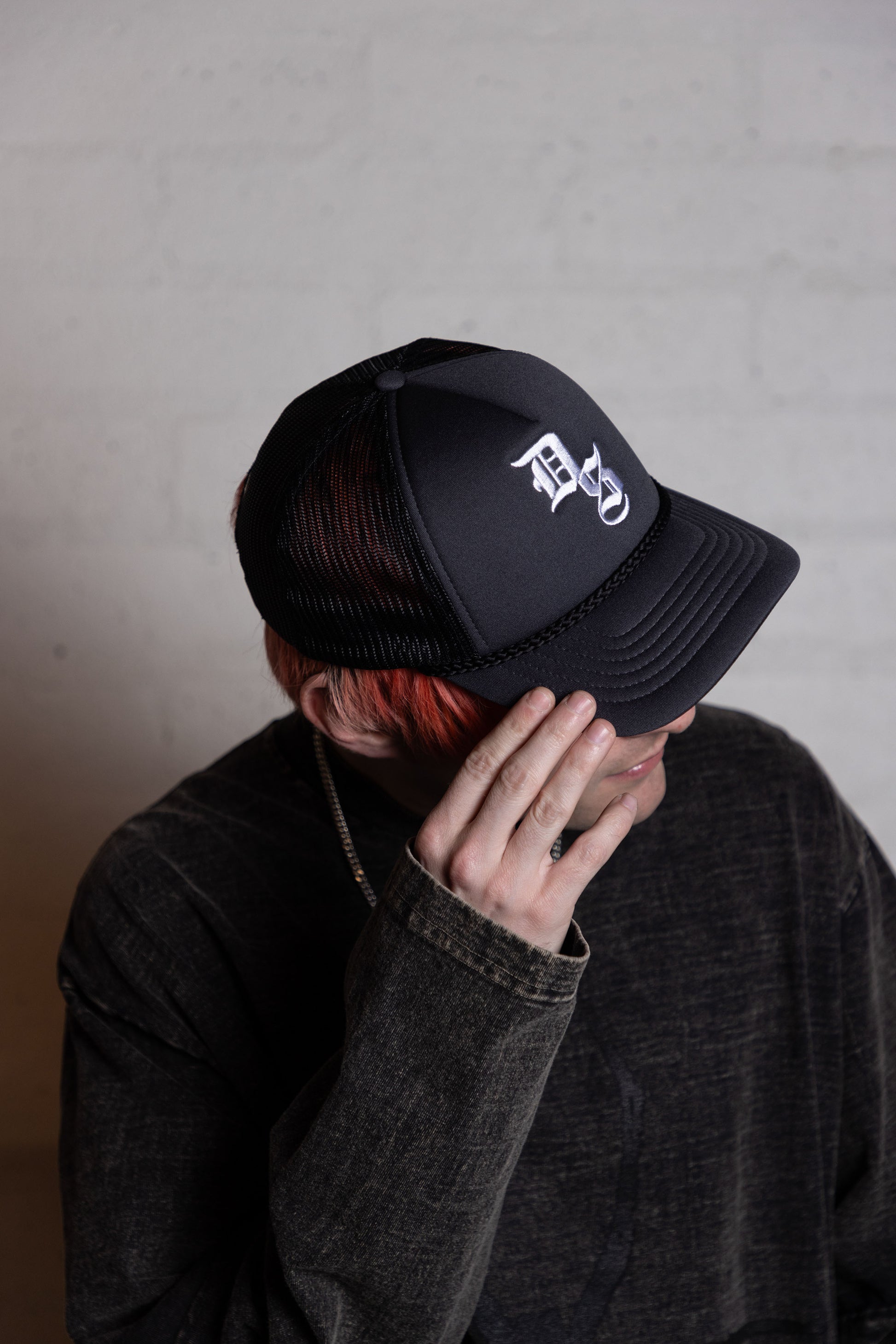 THE 'DS' HAT IS A HIGH STITCH COUNT EMBROIDERY ON THE FRONT AND DIVIIISION STREET PRINT ON THE BACK OF A HIGH QUALITY MESH BACKED TRUCKER HATS WITH A LEATHER CLASP BACK.